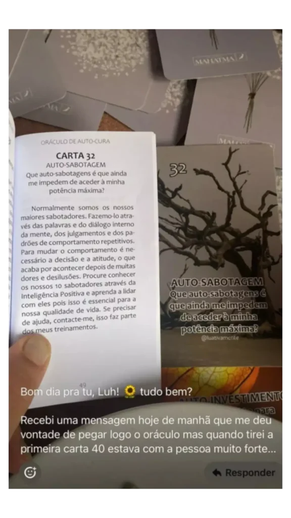 “Cada carta parece falar diretamente comigo, e as práticas diárias realmente me ajudam a manter o foco na minha transformação. Uma experiência incrível!”